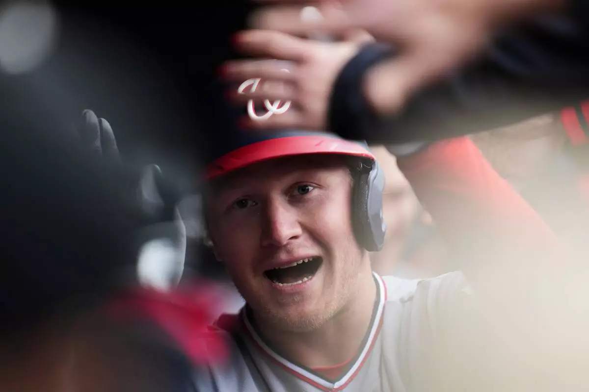 Washington Nationals' Joey Wiemer (21) is greeted in the dugout after hitting a home run during the second inning of an opening-day baseball game against the Chicago Cubs, Thursday, March 26, 2026, in Chicago. (AP Photo/Erin Hooley)