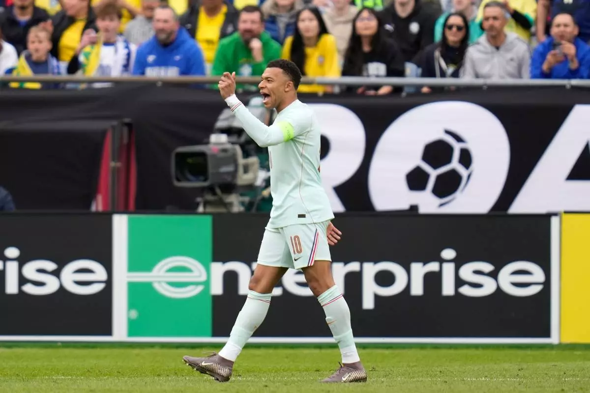 Kylian Mbappe of France gestures during the international friendly soccer match between Brazil and France in Foxborough, Mass, Thursday, March 26, 2026. (AP Photo/Charles Krupa)