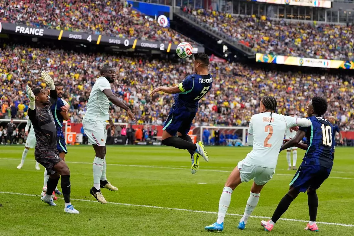 Brazil's Casemiro, center, heads the ball during the international friendly soccer match between Brazil and France in Foxborough, Mass, Thursday, March 26, 2026. (AP Photo/Charles Krupa)