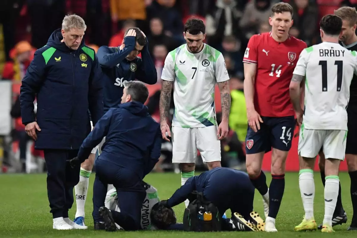 PRAGUE (AP) — Ireland midfielder Sammie Szmodics was stretchered off after being left unconscious following a heavy collision with an opponent in a World Cup qualification playoff game against the Czech Republic on Thursday.