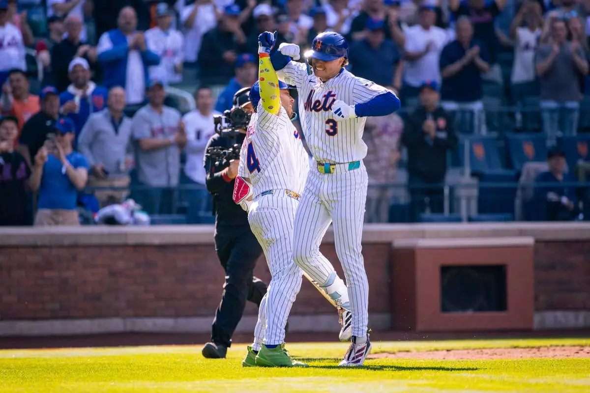 New York Mets' Carson Benge (3) celebrates after hitting a home run in the sixth inning of an opening-day baseball game against the Pittsburgh Pirates, Thursday, March 26, 2026, in New York. (AP Photo/Angelina Katsanis)