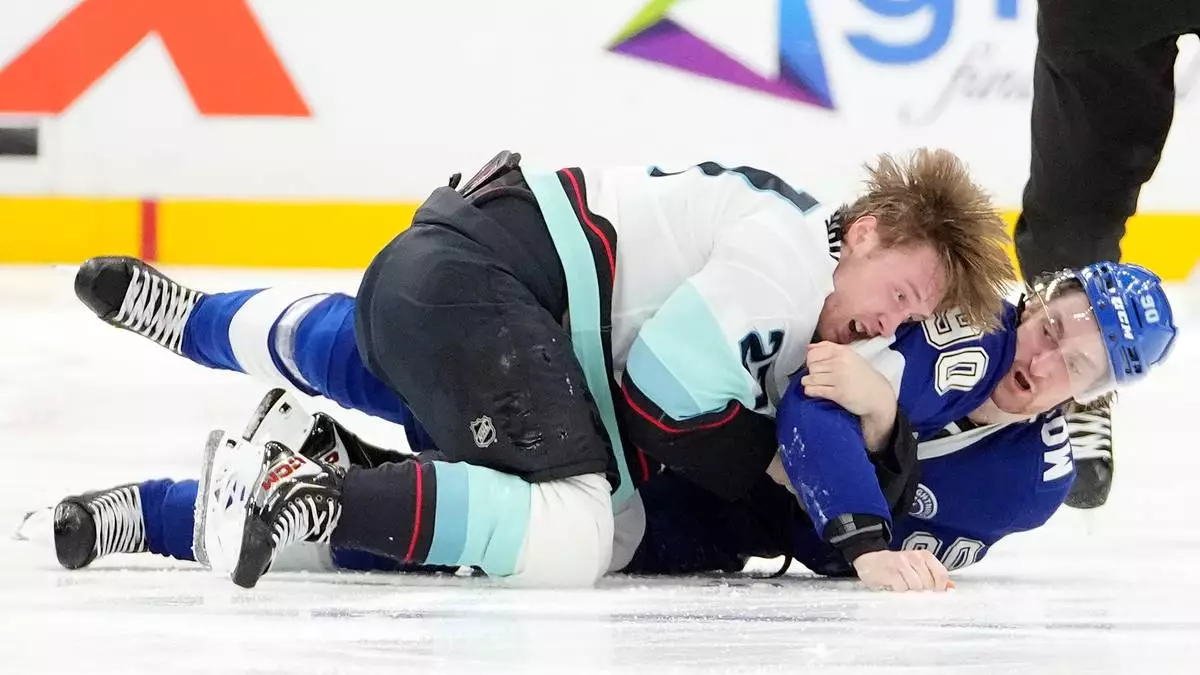 Seattle Kraken center Berkly Catton (27) and Tampa Bay Lightning defenseman J.J. Moser (90) go down while fighting during the second period of an NHL hockey game Thursday, March 26, 2026, in Tampa, Fla. (AP Photo/Chris O'Meara)