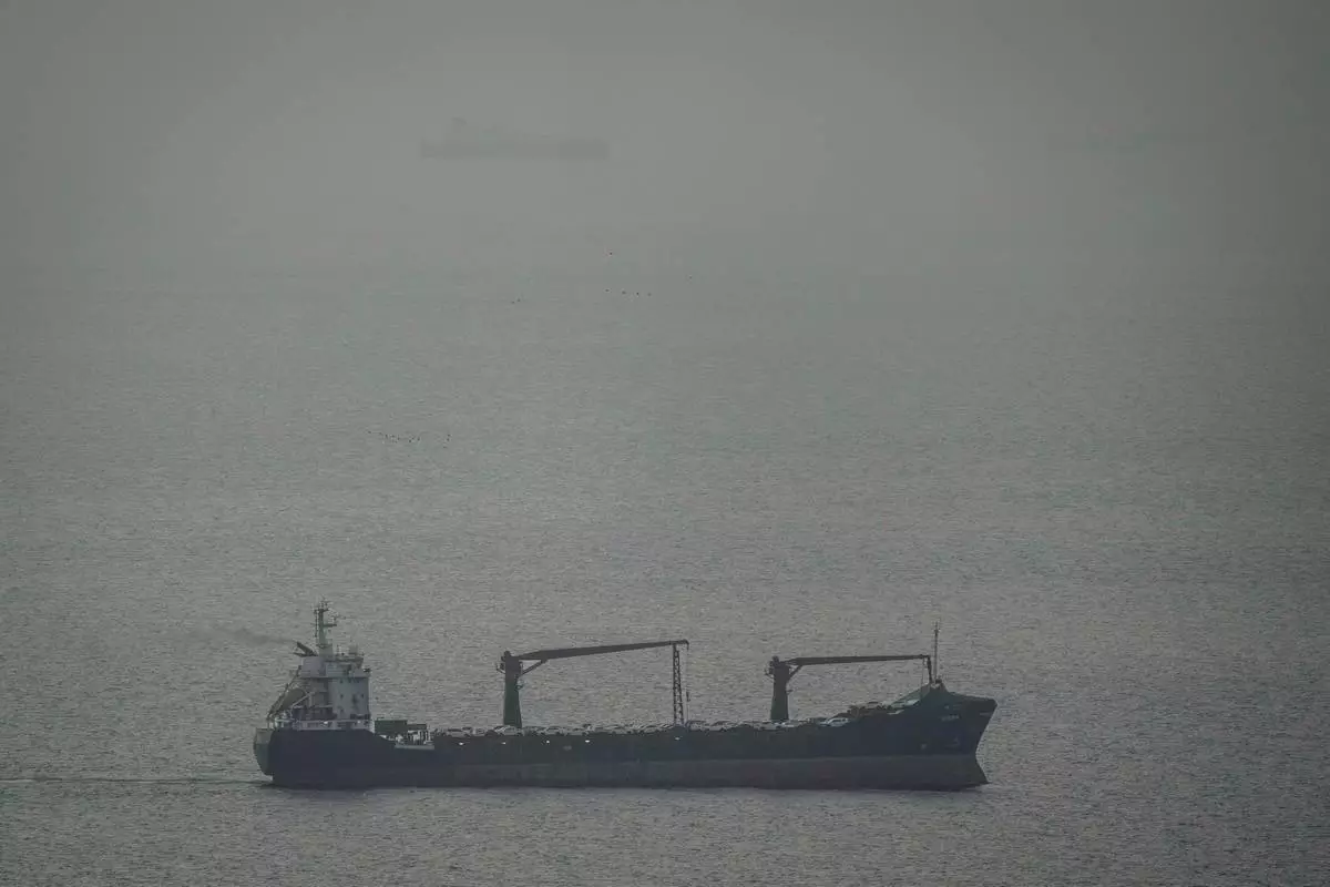 A cargo ship carrying vehicles sails through the Arabian Gulf toward the Strait of Hormuz in the United Arab Emirates, Sunday, March 22, 2026. (AP Photo)