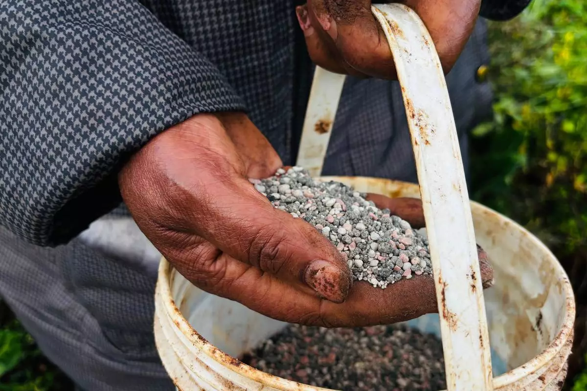 Elizabeth Wangua applies fertilizer to her land in Limuru, Kenya Wednesday, March 25, 2026. (AP Photo/Jackson Njehia)