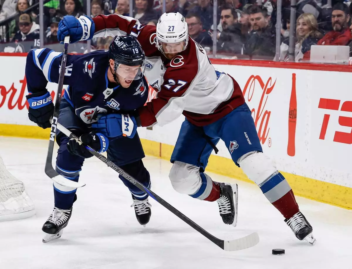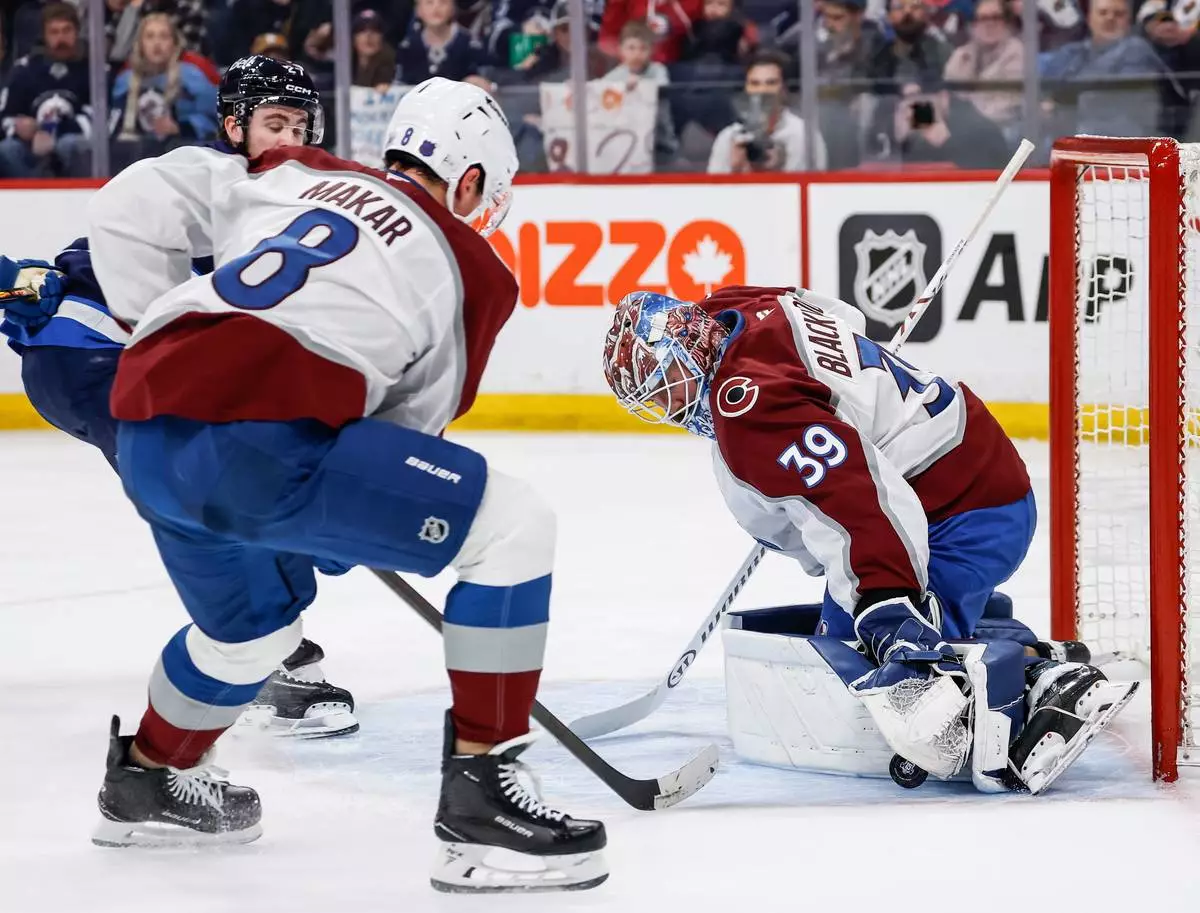 WINNIPEG, Manitoba (AP) — Nathan MacKinnon scored his 47th and 48th goals of the season to propel the Colorado Avalanche to a 3-2 victory over the Winnipeg Jets on Thursday night.