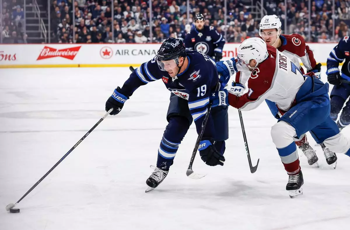 Colorado Avalanche's Devon Toews (7) defends against Winnipeg Jets' Jonathan Toews (19) during the second period of an NHL hockey game, in Winnipeg, Manitoba, Thursday, March 26, 2026. (John Woods/The Canadian Press via AP)
