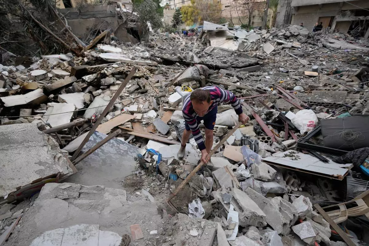 A man removes rubbles as he looks for missed stuff from his destroyed house that was hit in an Israeli airstrike in the southern port city of Tyre, Lebanon, Thursday, March 26, 2026. (AP Photo/Hussein Malla)