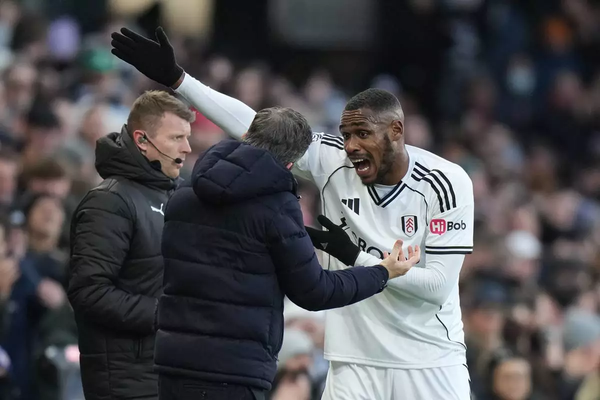 FILE - Fulham's Issa Diop speaks to Fulham's head coach Marco Silva during the English Premier League soccer match between Fulham and Liverpool in London, on Jan. 4, 2026. (AP Photo/Alastair Grant, File)
