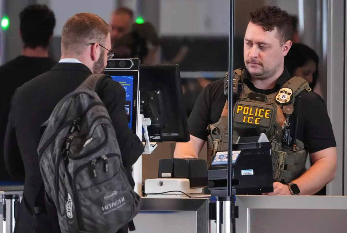 An ICE officer works at a TSA checkpoint at Pittsburgh International Airport in Imperial, Pa., on Thursday, March 26, 2026. (AP Photo/Gene J. Puskar)