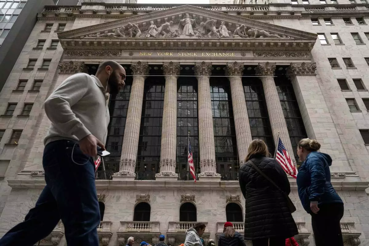 People walk past the New York Stock Exchange, Friday, March 27, 2026, in New York. (AP Photo/Yuki Iwamura)