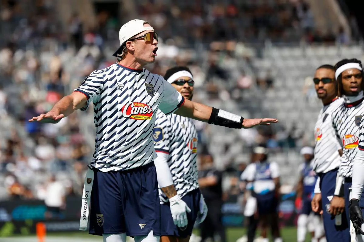 Founders FFC's Tom Brady reacts to a call made by the referee against the U.S. National Flag team during the Fanatics Flag Football Classic, Saturday, March 21, 2026, in Los Angeles. (AP Photo/Caroline Brehman)