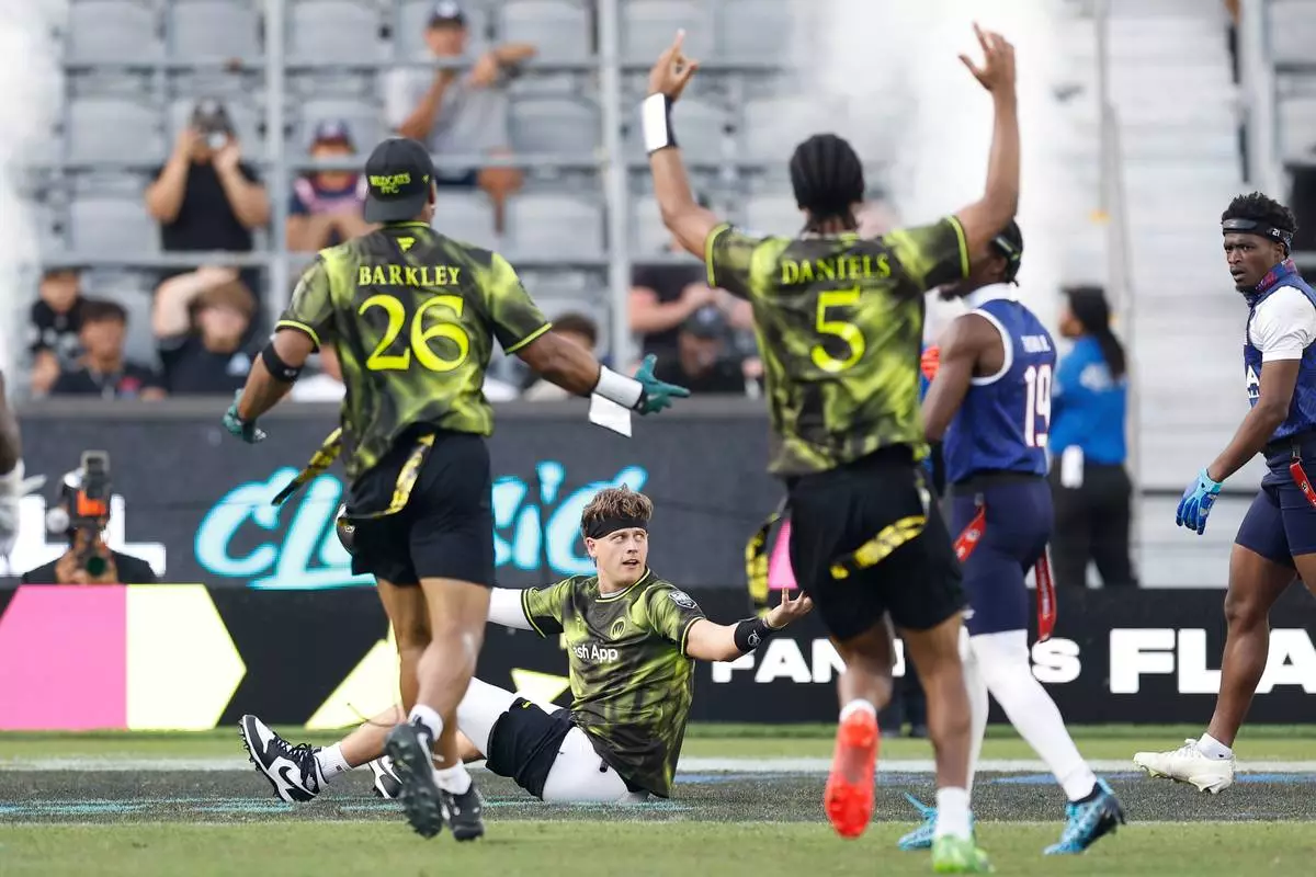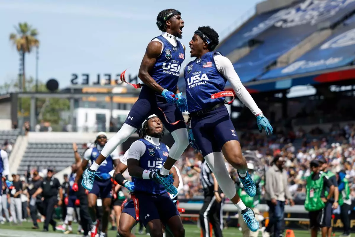 U.S. National Flag team's Isaiah Calhoun celebrates with teammate Shawn Theard Jr. the Fanatics Flag Football Classic against the Wildcats FFC, Saturday, March 21, 2026, in Los Angeles. (AP Photo/Caroline Brehman)