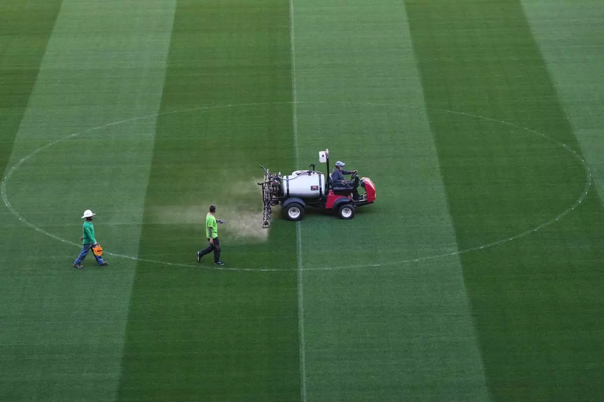 Workers traverse the pitch of the Azteca Stadium during a press tour showcasing renovations ahead of the 2026 World Cup, in Mexico City, Thursday, March 26, 2026. (AP Photo/Marco Ugarte)