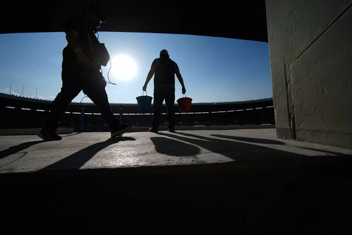 A worker carries buckets at the Azteca Stadium during a press tour showcasing renovations ahead of the 2026 World Cup, in Mexico City, Thursday, March 26, 2026. (AP Photo/Marco Ugarte)