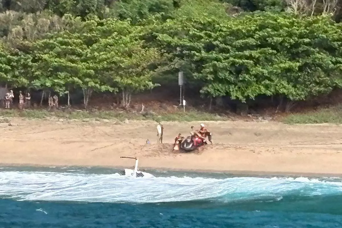 Kauai Ocean Safety members and other people assist individuals after an Airborne Aviation tourist helicopter crash on Kalalau Beach on Kauai, Hawaii, on March 26, 2026. (Petty Officer 2nd Class Tyler Robertson/Station Kauai/U.S. Coast Guard via AP)