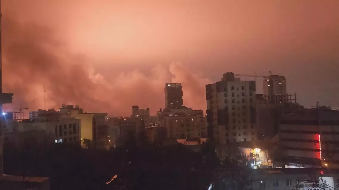 Explosions flashed and dense smoke billowed over the skyline of the capital, while the intermittent roar of air defense interceptors echoed across multiple districts, according to a China Media Group (CMG) reporter on the ground.
