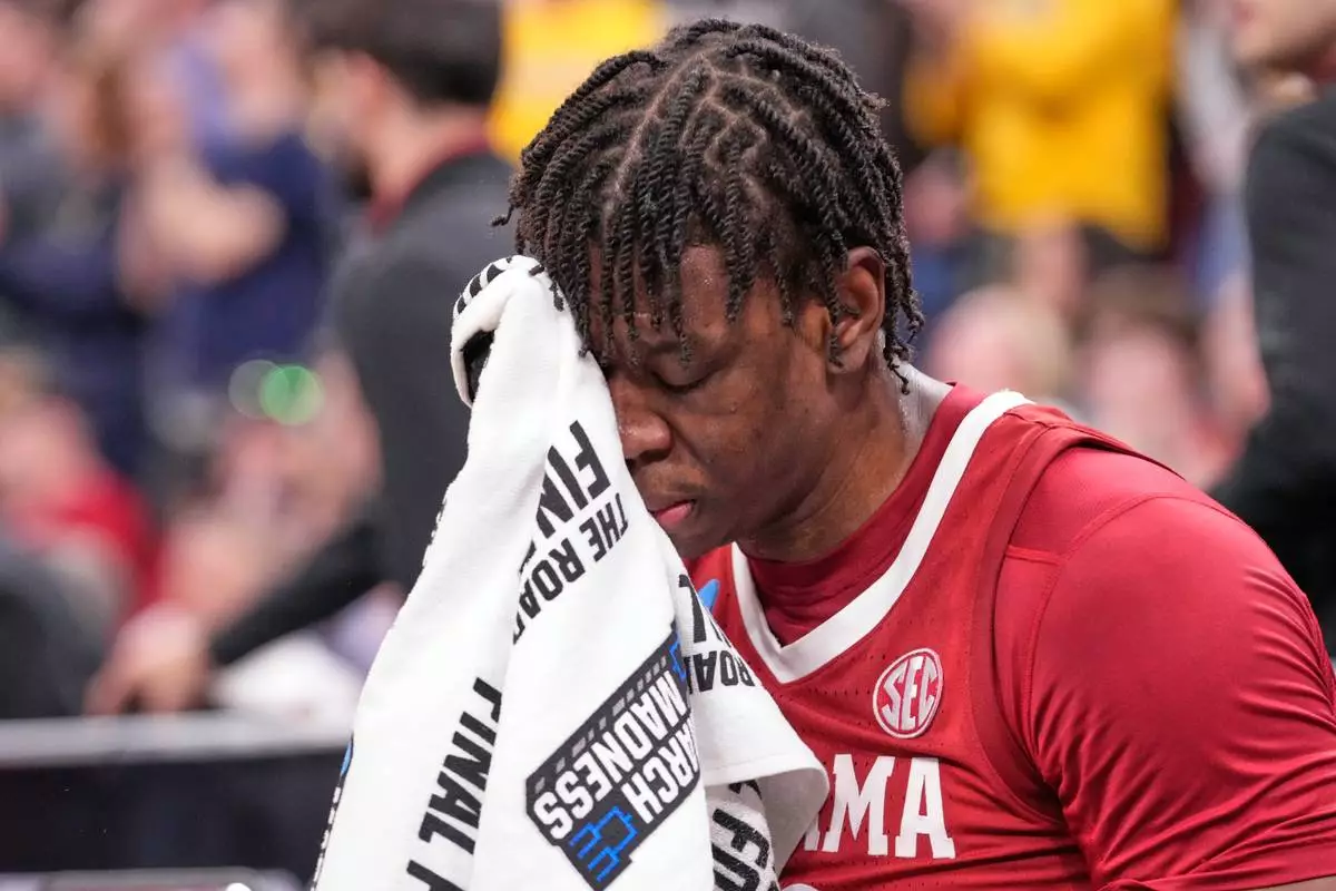 Alabama's Aiden Sherrell (22) wipes his face after losing to Michigan in a Sweet 16 NCAA college basketball tournament game, Friday, March 27, 2026, in Chicago. (AP Photo/Nam Y. Huh)