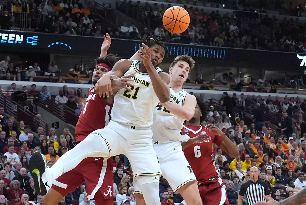 Michigan's Morez Johnson Jr. (21) reaches for a rebound between teammate Will Tschetter, right, and Alabama's Amari Allen, left, during the second half in the Sweet 16 of the NCAA college basketball tournament, Friday, March 27, 2026, in Chicago. (AP Photo/Nam Y. Huh)