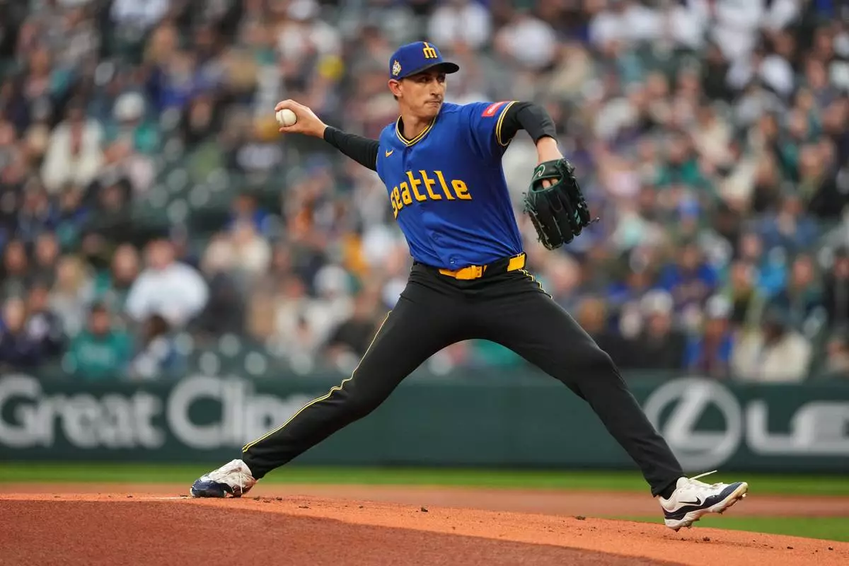 Seattle Mariners starting pitcher George Kirby throws against the Cleveland Guardians during the first inning of a baseball game, Friday, March 27, 2026, in Seattle. (AP Photo/Lindsey Wasson)