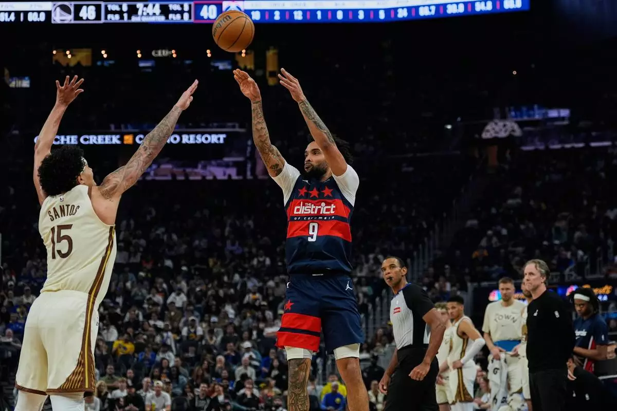 Washington Wizards forward Justin Champagnie (9) shoots a 3-point basket over Golden State Warriors forward Gui Santos (15) during the first half of an NBA basketball game, Friday, March 27, 2026, in San Francisco. (AP Photo/Godofredo A. Vásquez)