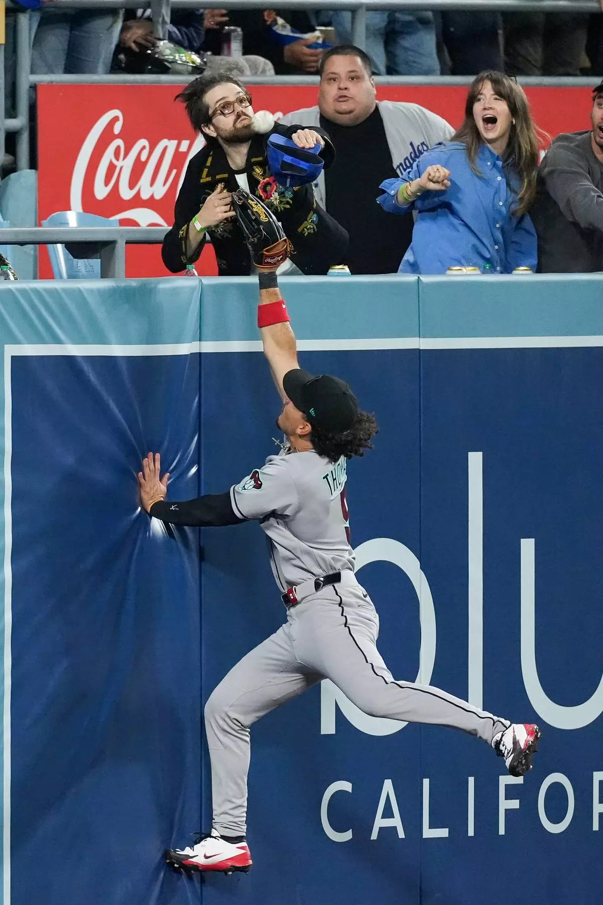 Arizona Diamondbacks center fielder Alek Thomas (5) leaps for the ball as it goes over the wall for a home run by Los Angeles Dodgers Mookie Betts (50) during the third inning of a baseball game Friday, March 27, 2026, in Los Angeles. (AP Photo/Caroline Brehman)