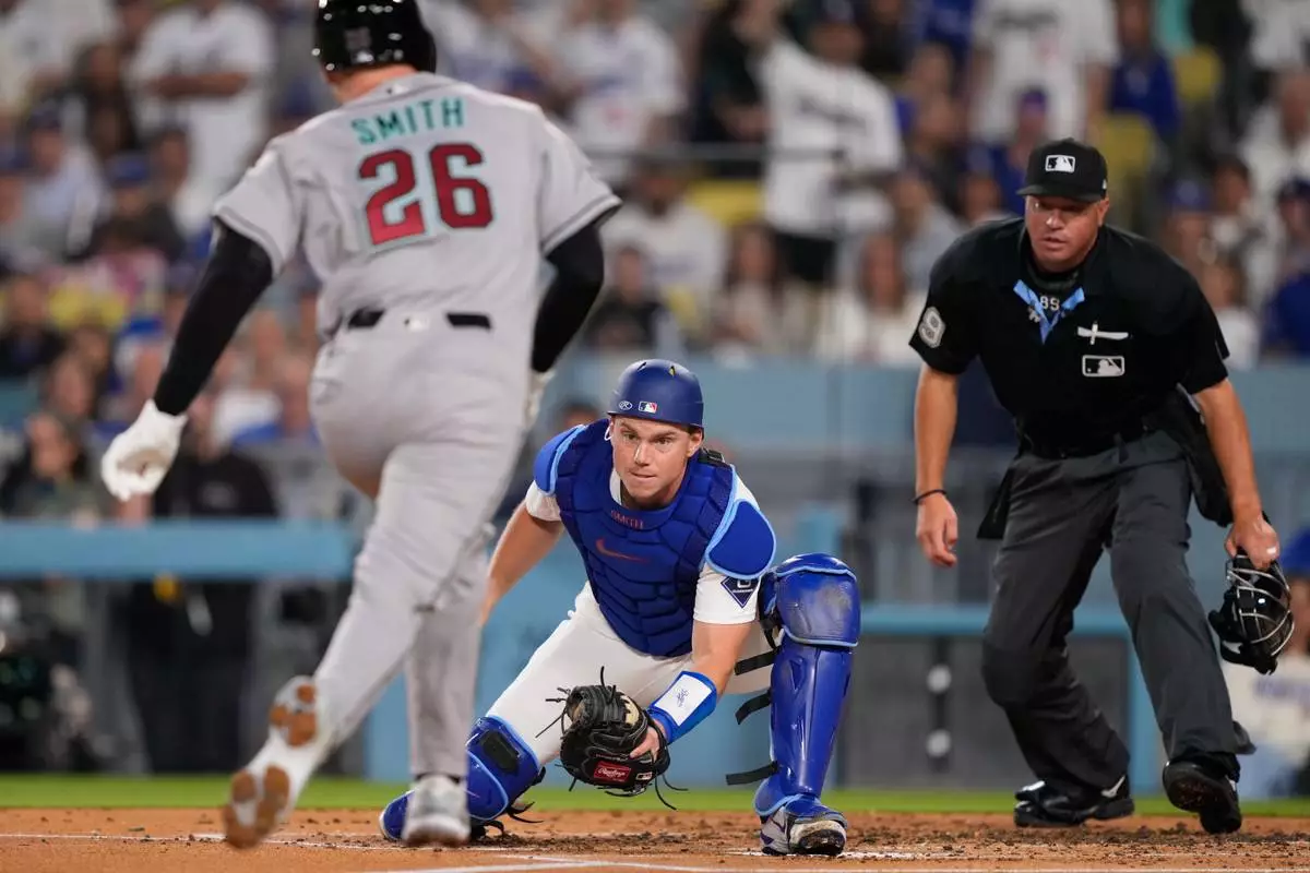 Arizona Diamondbacks' Pavin Smith, center, is tagged out by Los Angeles Dodgers catcher Will Smith as he tries to score on a double by Alek Thomas during the second inning of a baseball game Friday, March 27, 2026, in Los Angeles. (AP Photo/Mark J. Terrill)