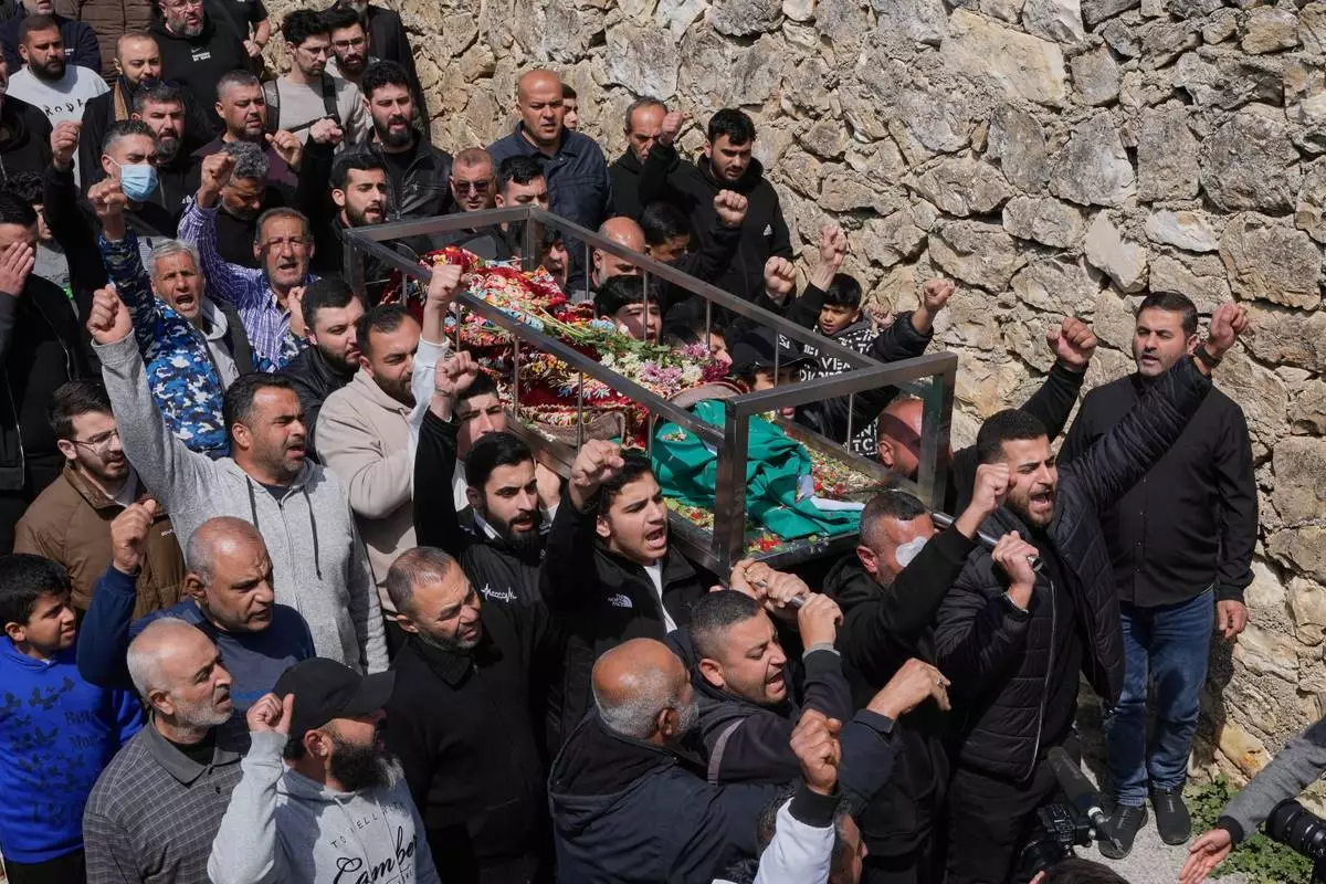 Mourners carry the coffin of Jawad Younes, 11, who was killed on Friday in an Israeli airstrike, as they shout slogans during a funeral procession in Saksakiyeh village, south Lebanon, Saturday, March 28, 2026. (AP Photo/Hussein Malla)