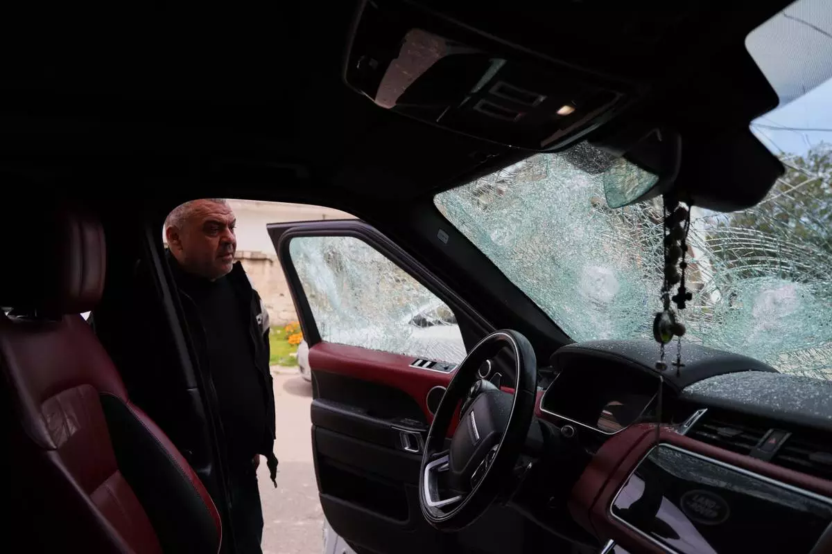 A man inspects a vehicle with shattered windows following overnight violence in the predominantly Christian town of Al-Suqaylabiyah, west of Hama, Syria, Saturday, March 28, 2026. (AP Photo/Omar Albam)