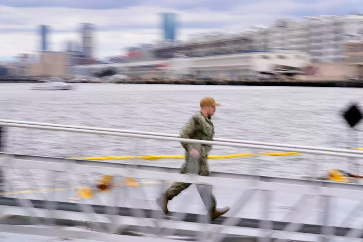 A sailors runs to board the USS Massachusetts during a rehearsal ahead of the commissioning of the Navy's newest nuclear-powered attack submarine, Friday, March 27, 2026, in Boston. (AP Photo/Robert F. Bukaty)