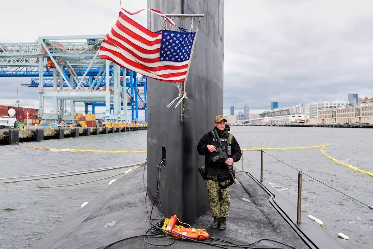 A sailor stands guard next to the sail of the USS Massachusetts, the Navy's newest nuclear-powered attack submarine, Friday, March 27, 2026, in Boston. (AP Photo/Robert F. Bukaty)