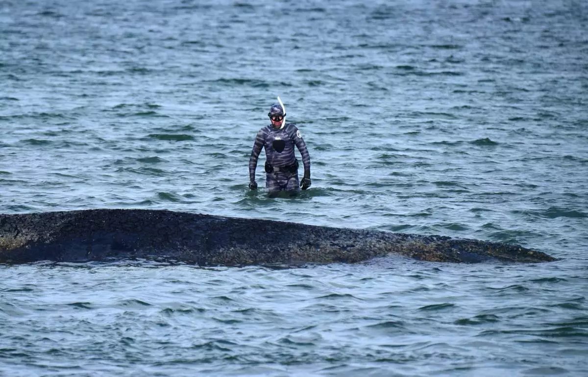 Robert Marc Lehmann, biologist, examines a stranded whale in the Baltic Sea in Timmendorfer Strand, Germany, Thursday, March 26, 2026. (Daniel Bockwoldt/dpa via AP)