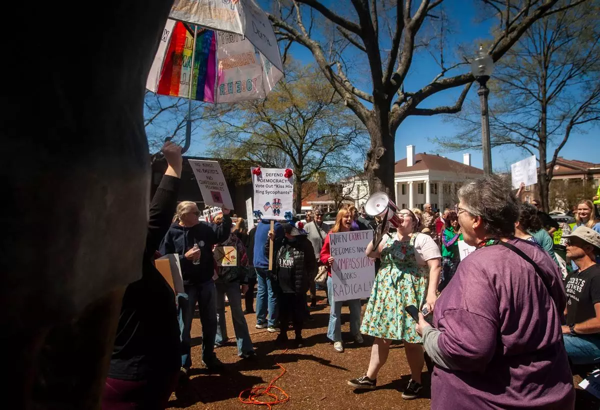 Demonstrators gather for the "No Kings" rally at Wilson Park in Florence, Ala, on Saturday, March 28, 2026. (Dan Busey/The TimesDaily via AP)