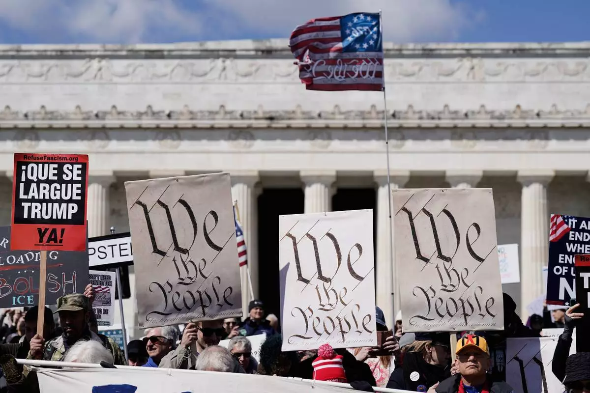 Demonstrators rally in front of the Lincoln Memorial during the No Kings protest in Washington, Saturday, March 28, 2026. (AP Photo/Jose Luis Magana)
