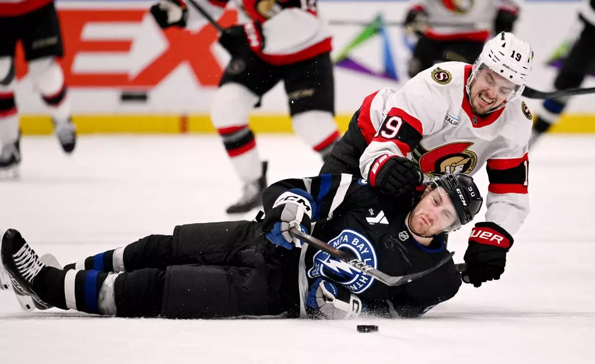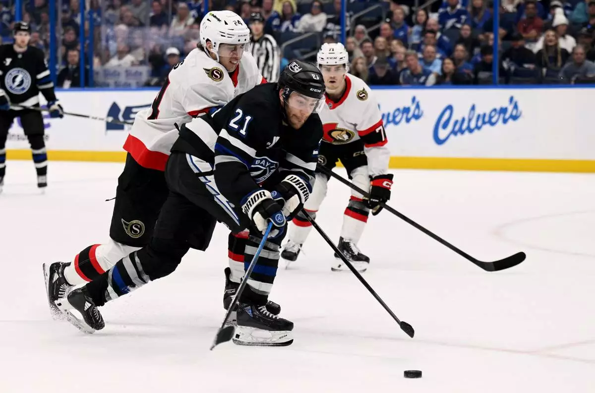 Tampa Bay Lightning center Brayden Point (21) and Ottawa Senators center Dylan Cozens (24) battle for the puck during the second period of an NHL hockey game Saturday, March 28, 2026, in Tampa, Fla. (AP Photo/Jason Behnken)