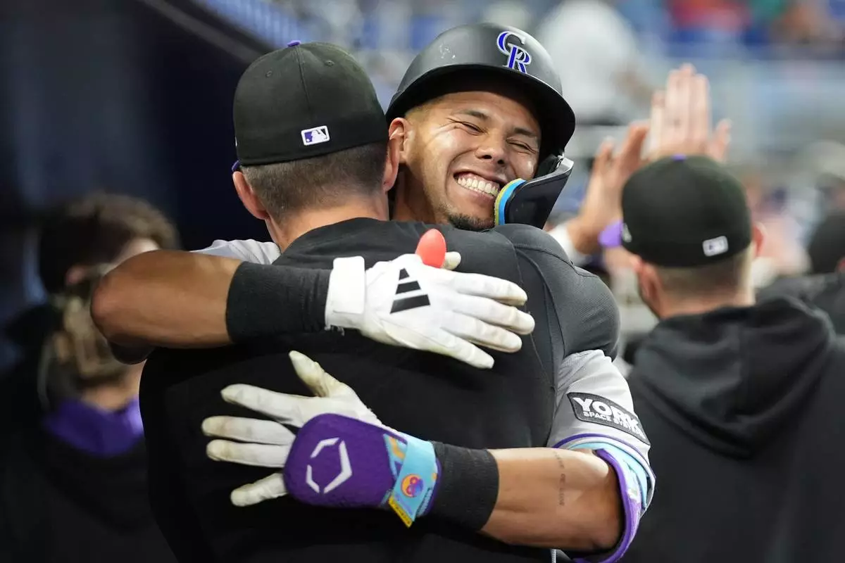 Colorado Rockies' Ezequiel Tovar is embraced in the dugout after hitting a two run home run during the fourth inning of a baseball game against the Miami Marlins, Saturday, March 28, 2026, in Miami. (AP Photo/Lynne Sladky)