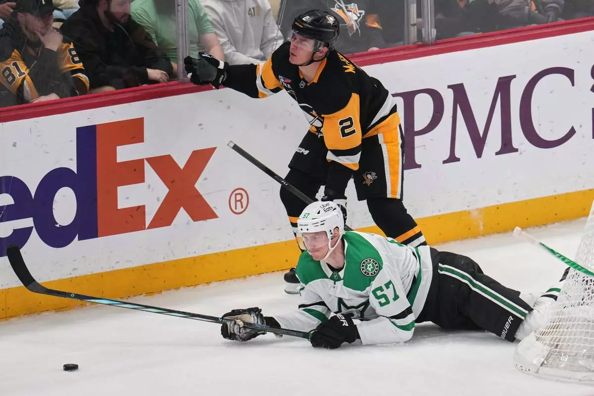 Pittsburgh Penguins' Rutger McGroarty (2) trips Dallas Stars' Tyler Myers (57) during the first period of an NHL hockey game in Pittsburgh, Saturday, March 28, 2026. (AP Photo/Gene J. Puskar)