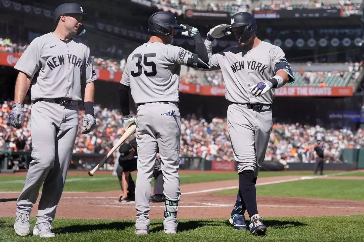 New York Yankees' Aaron Judge, right, is congratulated by Cody Bellinger (35) after hitting a two-run home run that also scored Paul Goldschmidt, left, during the sixth inning of a baseball game against the San Francisco Giants in San Francisco, Friday, March 27, 2026. (AP Photo/Jeff Chiu)