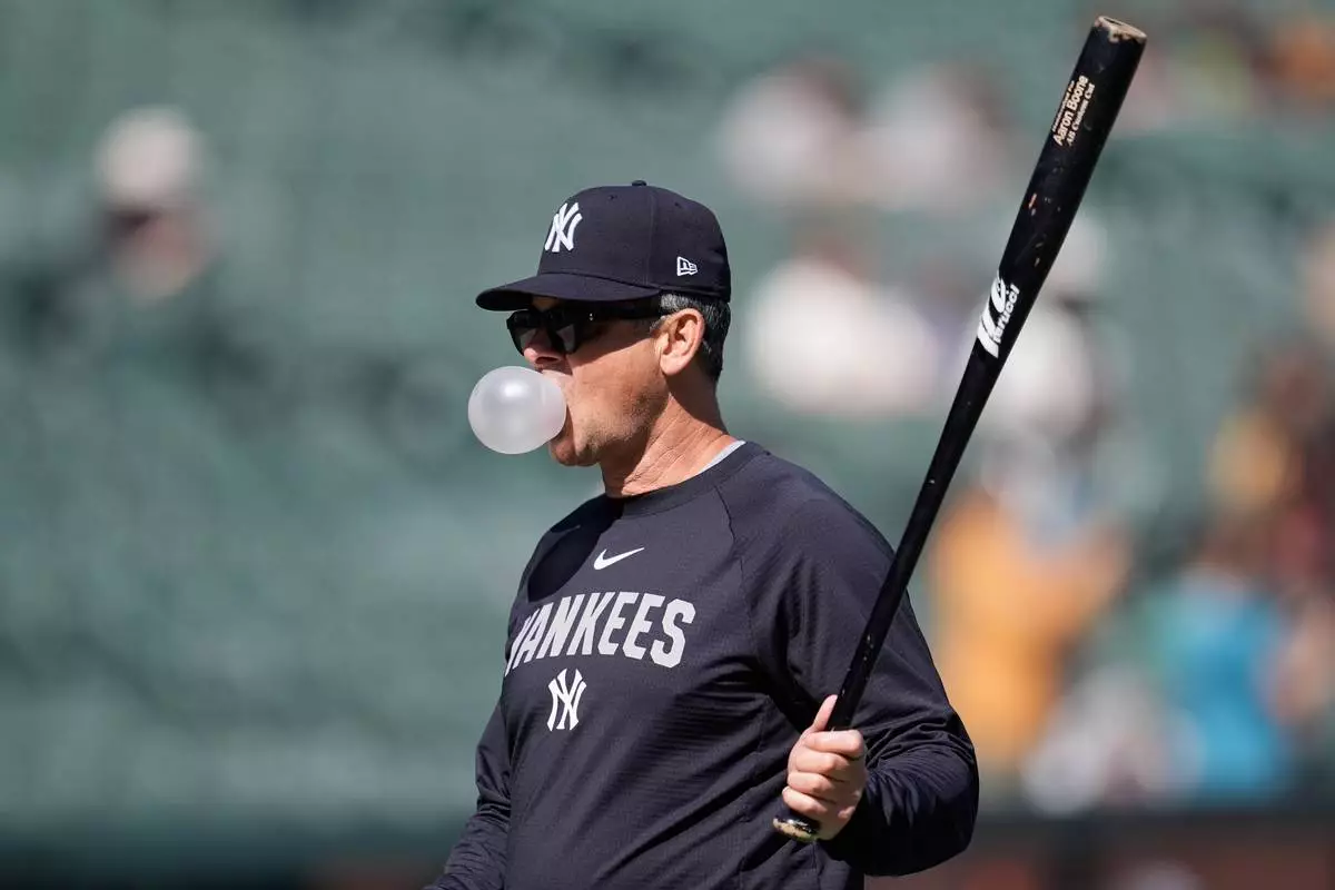 New York Yankees manager Aaron Boone blows a bubble as he watches players take batting practice before a baseball game against the San Francisco Giants in San Francisco, Saturday, March 28, 2026. (AP Photo/Jeff Chiu)