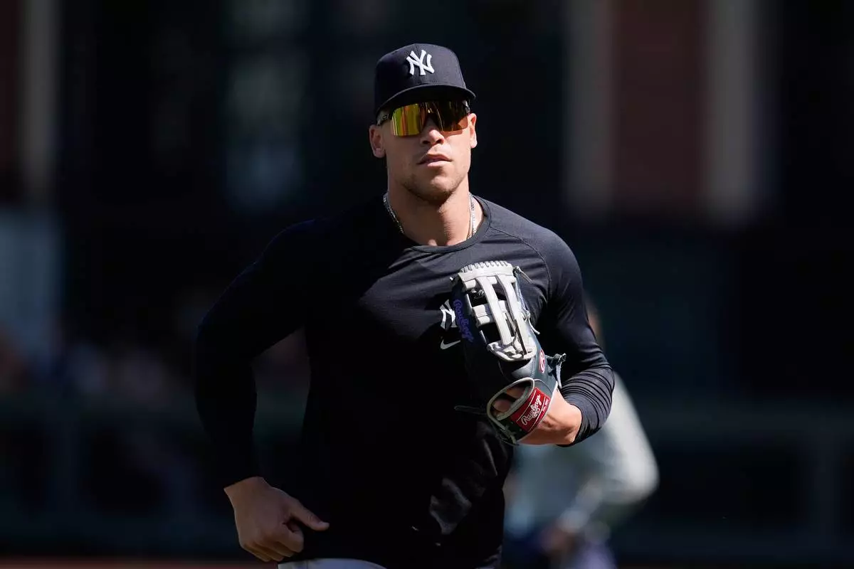 New York Yankees' Aaron Judge jogs on the field while warming up before a baseball game against the San Francisco Giants in San Francisco, Saturday, March 28, 2026. (AP Photo/Jeff Chiu)