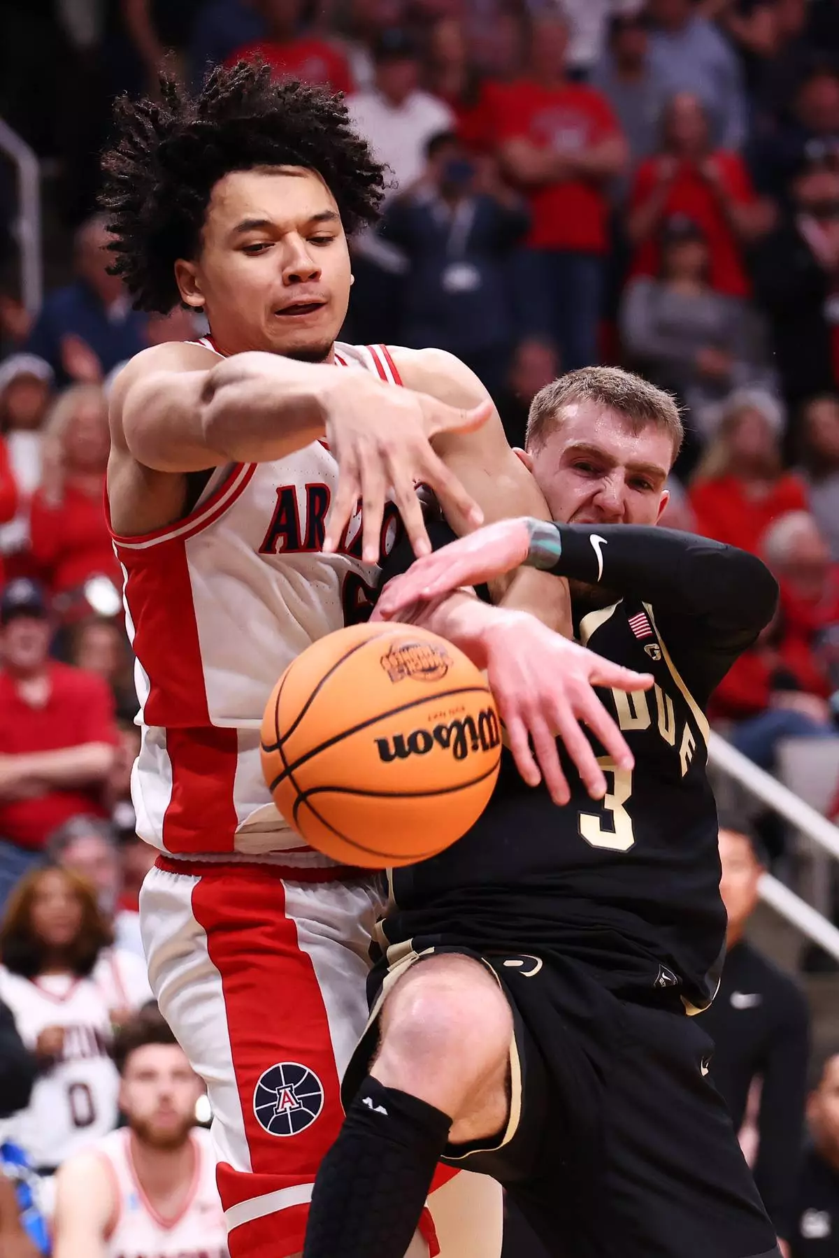 Arizona guard Brayden Burries, left, works for a rebound against Purdue guard Braden Smith during the second half in the Elite Eight of the NCAA college basketball tournament, Saturday, March 28, 2026, in San Jose, Calif. (AP Photo/Kelley L Cox)