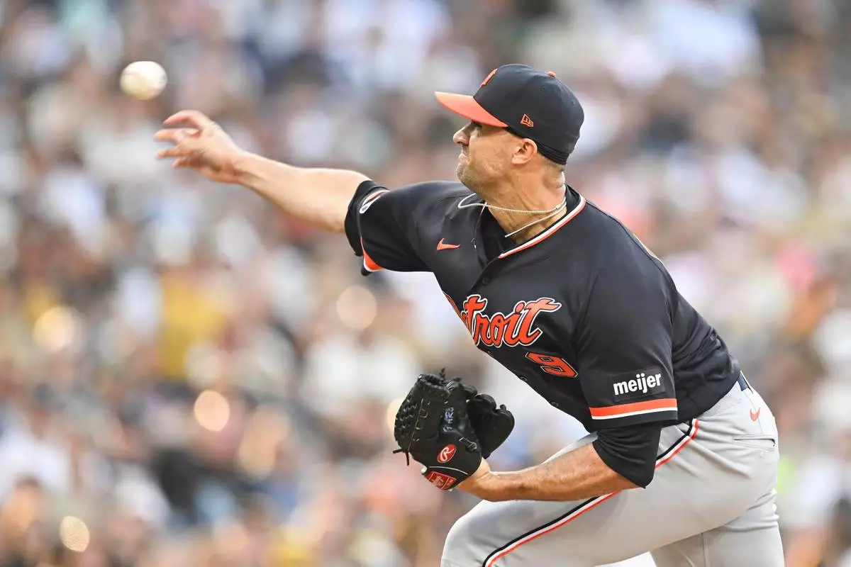 Detroit Tigers starting pitcher Jack Flaherty delivers during the first inning of a baseball game against the San Diego Padres Saturday, March 28, 2026, in San Diego. (AP Photo/Denis Poroy)