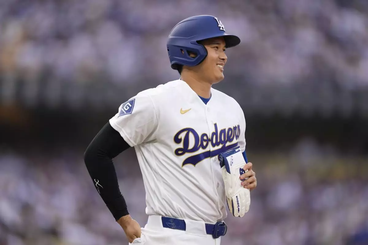 Los Angeles Dodgers' Shohei Ohtani smiles as he heads to first after walking during the first inning of a baseball game against the Arizona Diamondbacks, Saturday, March 28, 2026, in Los Angeles. (AP Photo/Mark J. Terrill)
