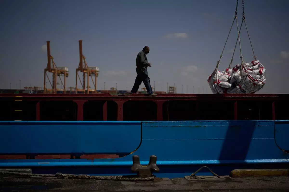 A worker walks on the deck of a feeder vessel as he works to offload cargo of rice into trucks at Umm Qasr Port, a deep-water port, in the city of Umm Qasr, Iraq, Friday, March 27, 2026. (AP Photo/Leo Correa)