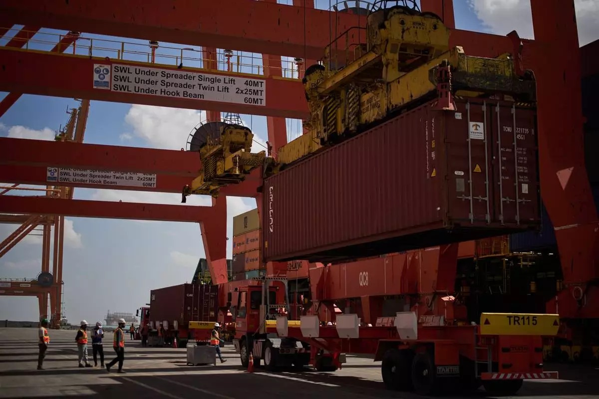 Dockworkers unload cargo containers into trucks at Umm Qasr Port, a deep-water port, in the city of Umm Qasr, Iraq, Friday, March 27, 2026. (AP Photo/Leo Correa)