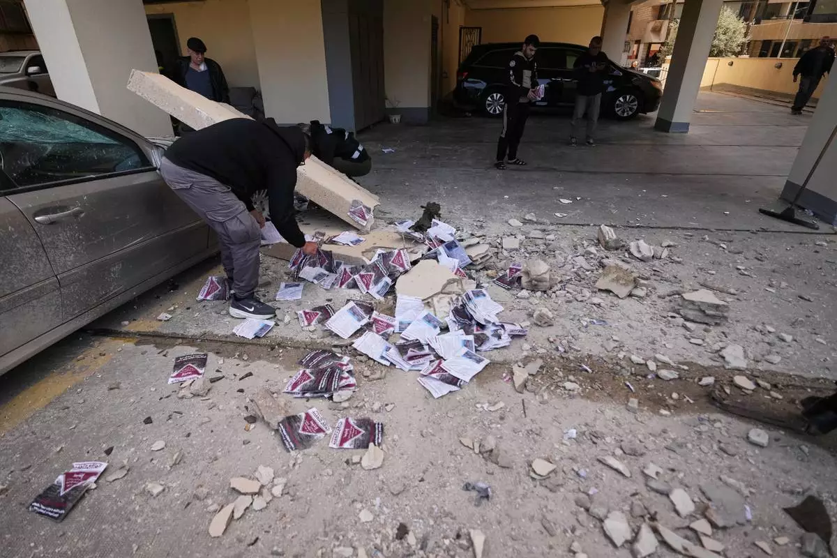 People collect leaflets scattered on the ground at a site where a projectile carrying them hit an apartment building in Beirut, Lebanon, Saturday, March 28, 2026. (AP Photo/Hassan Ammar)