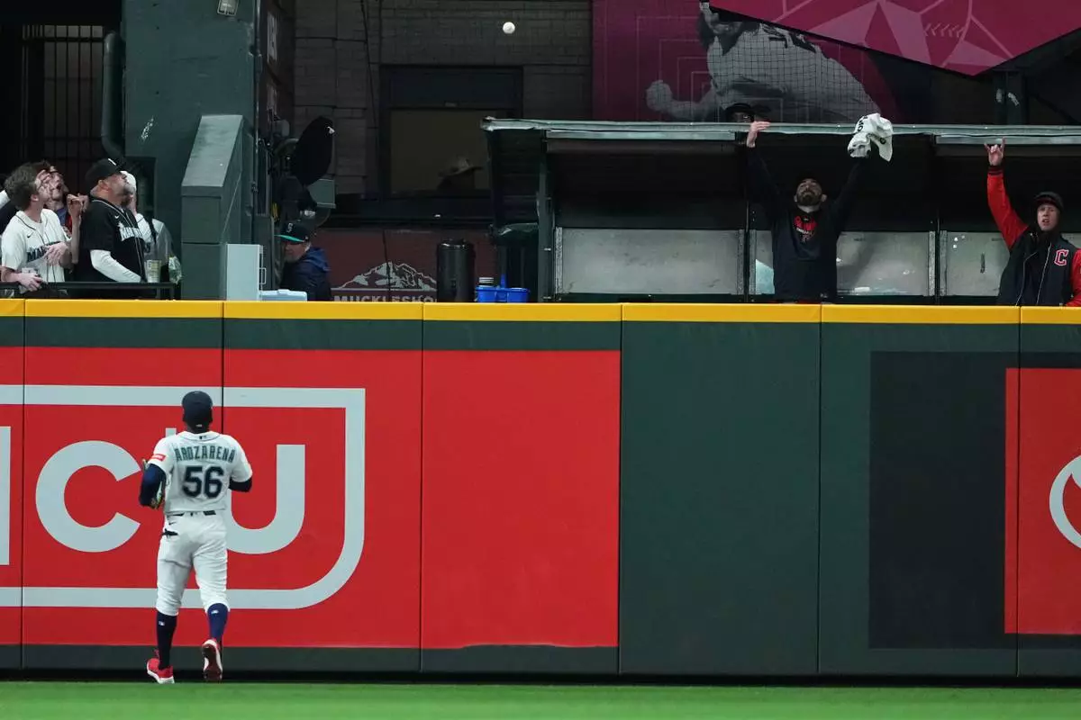 Seattle Mariners left fielder Randy Arozarena watches the two-run home run from Cleveland Guardians' Chase DeLauter fly over the fence during the 10th inning of a baseball game, Saturday, March 28, 2026, in Seattle. (AP Photo/Lindsey Wasson)
