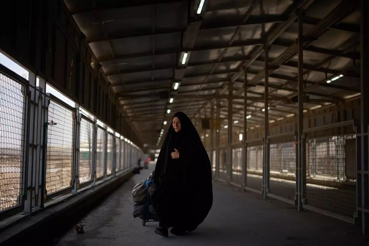 Carrying her belongings a woman crosses the Shalamcheh border crossing between Iran and Iraq, near Basra, Iraq, Sunday, March 29, 2026. (AP Photo/Leo Correa)