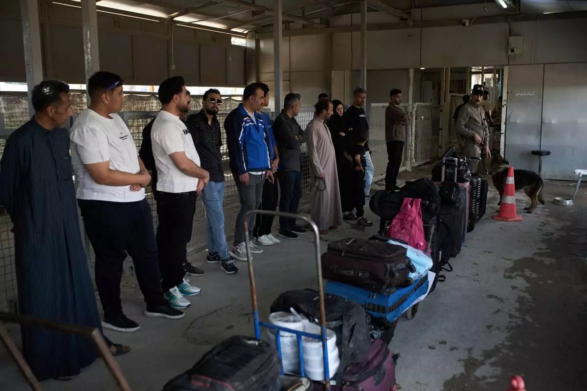 People who arrived from Iran wait in line prior to having their belongings checked by a sniffer dog as they cross the Shalamcheh border crossing between Iran and Iraq, near Basra, Iraq, Sunday, March 29, 2026. (AP Photo/Leo Correa)
