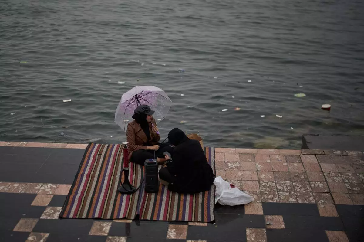 Women sit alongside the Shatt al-Arab River, on the corniche of Basra, Iraq, Thursday, March 26, 2026. (AP Photo/Leo Correa)