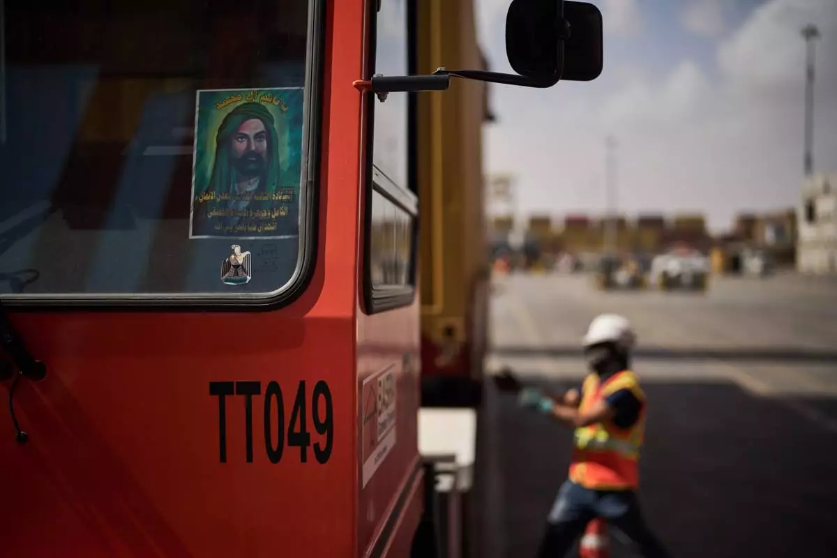 An image depicting Ali ibn Abi Talib, the cousin and son-in-law of the Prophet Muhammad, who is revered by Muslims particularly Shiite sect, is displayed on the windshield of a truck as dockworkers unload cargo containers at Umm Qasr Port, a deep-water port, in the city of Umm Qasr, Iraq, Friday, March 27, 2026. (AP Photo/Leo Correa)